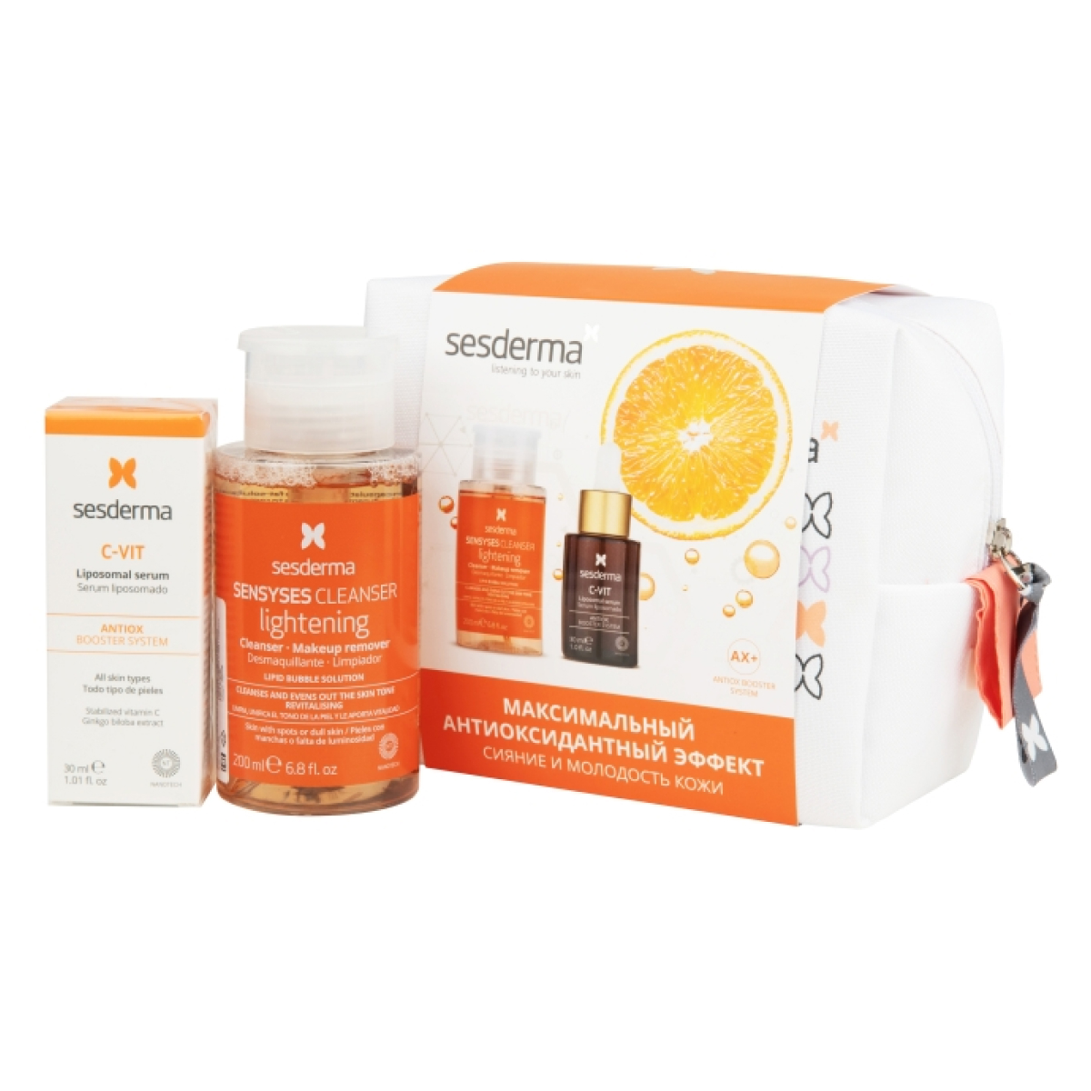 Sesderma Набор C-VIT Сыворотка + SENSYSES Lightening – Лосьон тоник для снятия макияжа для тусклой кожи + Косметичка, 30мл + 200мл