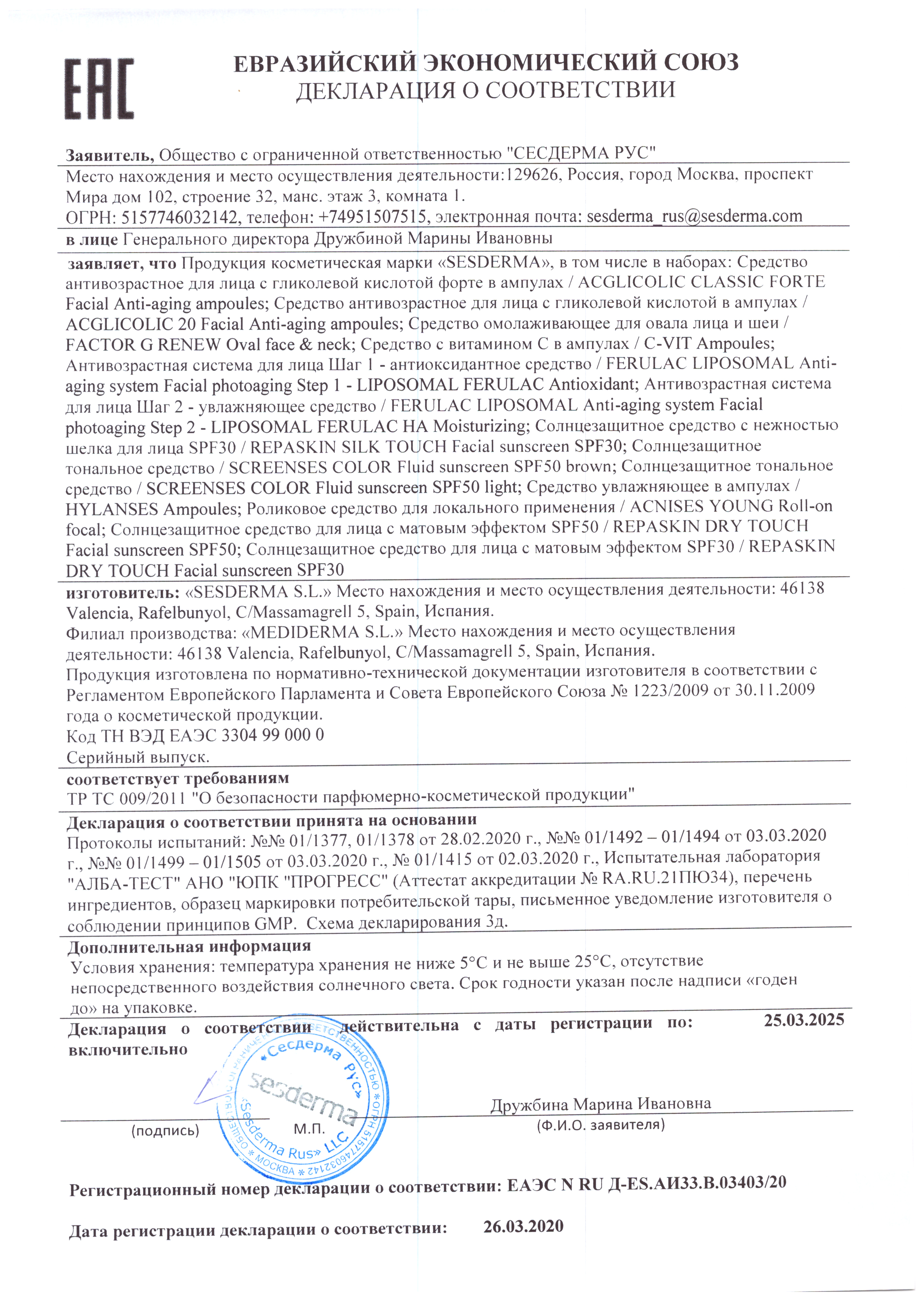 • Произведено в Испании (фабрика Сесдерма по выпуску уходовой аптечной и профессиональной косметики премиум-уровня расположена в Валенсии)