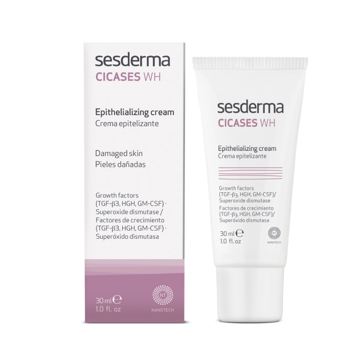 Sesderma CICASES WH Epithelializing cream - Регенерирующий крем для травмированных и сложных участков кожи Сесдерма, 30 мл, содержащий факторы роста, гиалуроновую кислоту, экстракты красных водорослей и лопуха, коэнзим Q10, молекулу Q10, молочную кислоту, масло ши и растительный сквален, повышает темп клеточного обновления эпидермиса, помогает заживлению ран, эрозий, ожогов. Крем от Сесдерма CICASES WH Epithelializing cream дает замечательные исходы после хирургических процедур, для предупреждения и терапии пролежней, а также для заботы о зоне вокруг повреждений. Sesderma CICASES WH Epithelializing cream - Регенерирующий крем для травмированных и сложных участков кожи Сесдерма, 30 мл создан с применением технологии NANOTECH. Ее особенности состоят в размещении биоактивных компонентов в наноразмерных липосомах – мини-контейнерах, помогающих веществам глубоко проникать в дерму, тем самым усиливая действенность крема от Сесдерма CICASES WH Epithelializing cream.