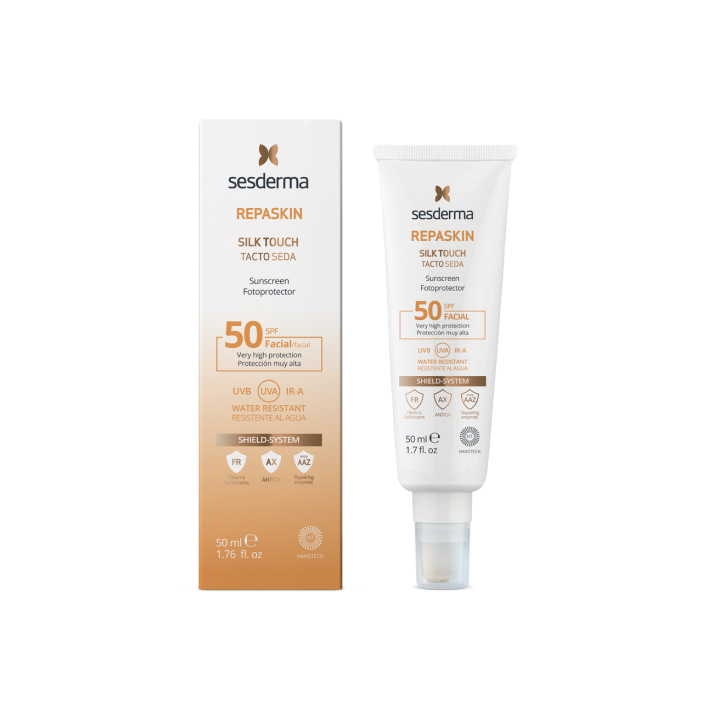 Солнцезащитный препарат с шелковым эффектом для лица, основанный на липосомированных веществах, ферментах, экстрактах зеленого чая и расторопши, Sesderma REPASKIN SILK TOUCH Facial sunscreen SPF 50 - Солнцезащитный продукт для кожи лица с шелковой мягкостью, надежная охрана от ультрафиолета SPF 50 матирует лицо, мгновенно абсорбируется, без белых следов на эпидермисе. Защищает от ожогов и красноты, проявлений фотостарения и повреждений ДНК, отлично способствует восстановлению кожи.