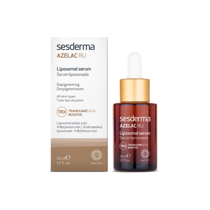 Липосомальная сыворотка с липосомированными компонентами, ретинолом, стабилизированным витамином С и глицирретиновой кислотой Sesderma AZELAC RU Liposomal serum обладает отбеливающим, противовоспалительным и антиоксидантным действием. Средство эффективно даже при коже с высокими фототипами, сокращая поствоспалительную гиперпигментацию и мелазму. Сыворотка создана с применением технологии NANOTECH, благодаря которой активные вещества заключены в наноразмерные липосомы — микролипидные оболочки, способствующие глубокому проникновению компонентов и повышающие эффективность ухода.